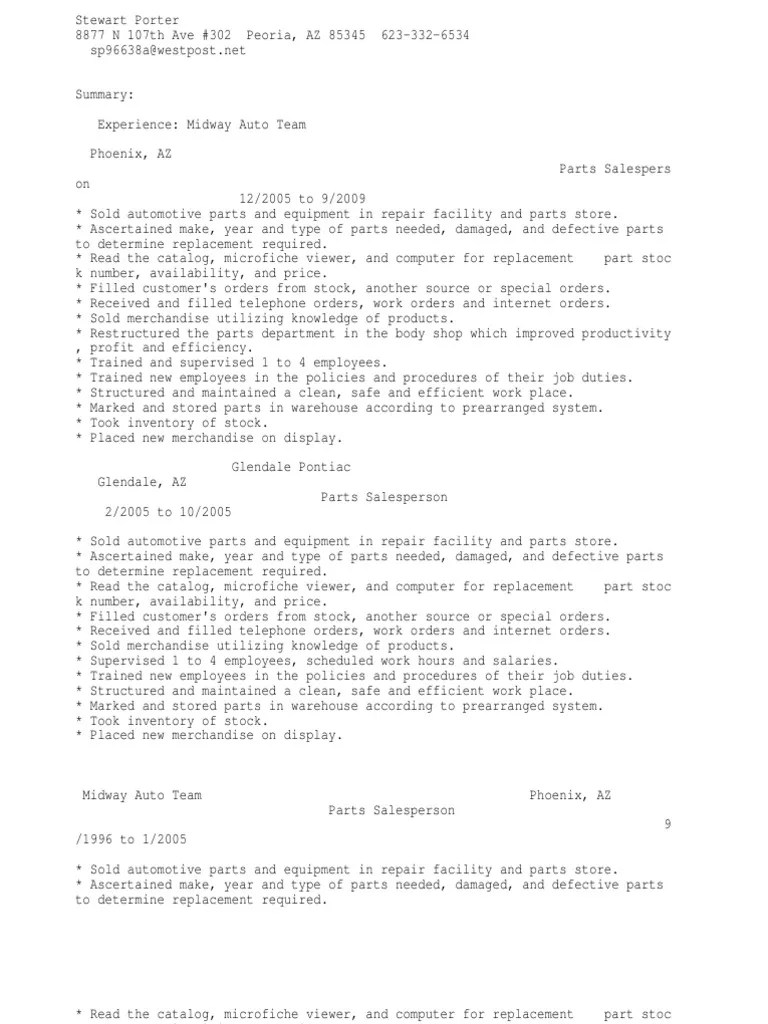 Parts Counterman Resume Samples QwikResume